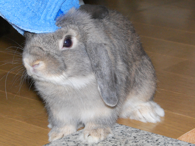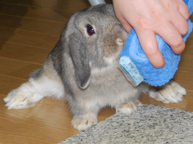 魅惑の香りは、うさぎをだめにするので、呆然としている、グレーのもこもこくんを冷やしてさしあげる。