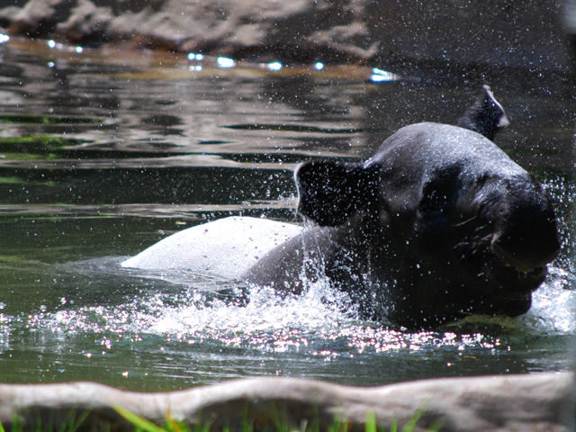 水浴びで30℃を越える暑さをしのぐ、マレーバク。