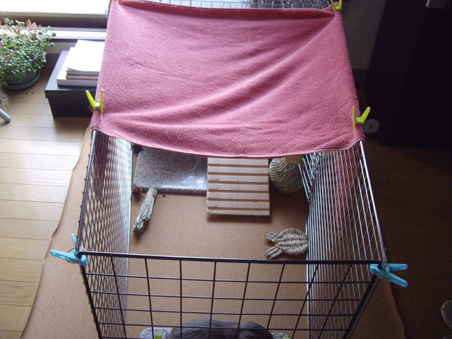 ケージ前のスロープをつかって、逃げられたので、とりあえずそれはできない範囲での処置です。